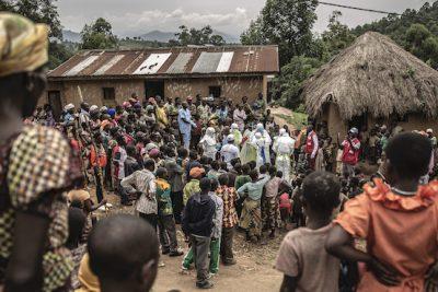 Des voisins et employés de la Croix Rouge en tenue de protection se rassemblent devant le domicile d’une fillette de 11 ans décédée lors de l’épidémie d’Ebola dans la ville de Rutshuru au Nord-Kivu, février 2020 © Finbarr O’Reilly