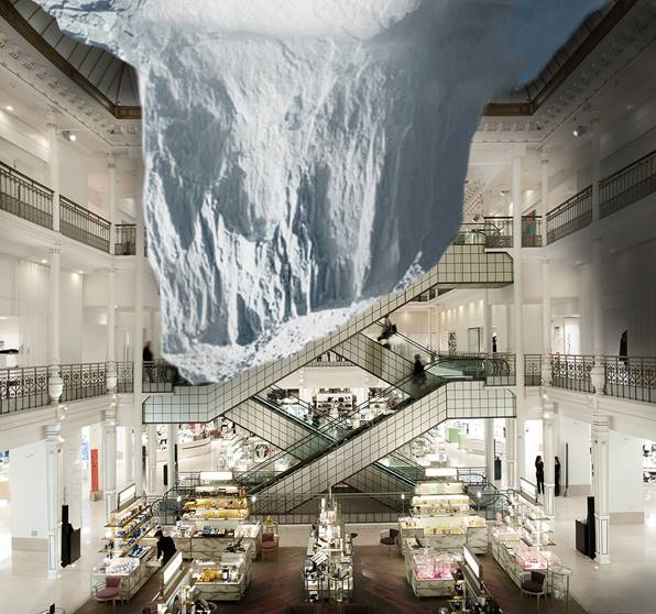 Au cœur du bâtiment, Mehmet Ali Uysal déploie d’immenses icebergs suspendus aux verrières centrales du magasin. Ces cathédrales de glace brisent le silence par leur imposante matérialité. Architecte de formation et diplômé en sculpture de l’Ecole des Beaux-Arts d’Ankara, Mehmet Ali Uysal conçoit des installations qui déjouent notre perception de l’espace. Il provoque de surprenantes rencontres entre formes et matières et propose de subtiles relations entre ses œuvres et le visiteur. Le terme « vêlage » indique la naissance d’un iceberg et décrit le moment où le bloc de glace se détache du glacier pour rejoindre l’océan. Plongé sous l’eau par Mehmet Ali Uysal, le Bon Marché Rive Gauche abrite la partie immergée de ces géants venus du froid.