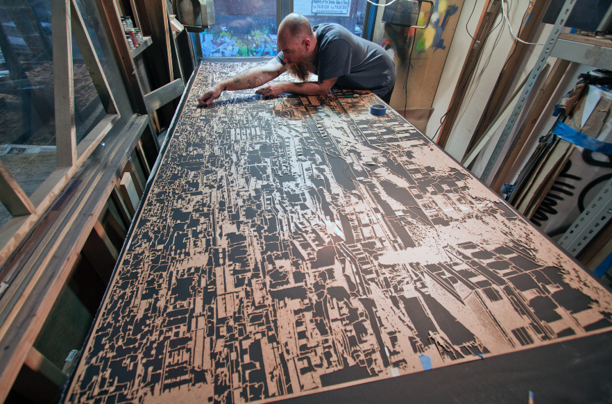 J’utilise des pochoirs pour créer mes tableaux et mes fresques. Je travaille généralement le paysage urbain mais pour l’exposition à la Galerie Artistik Rezo et dans le cadre du festival America, je me suis inspiré du monde littéraire.