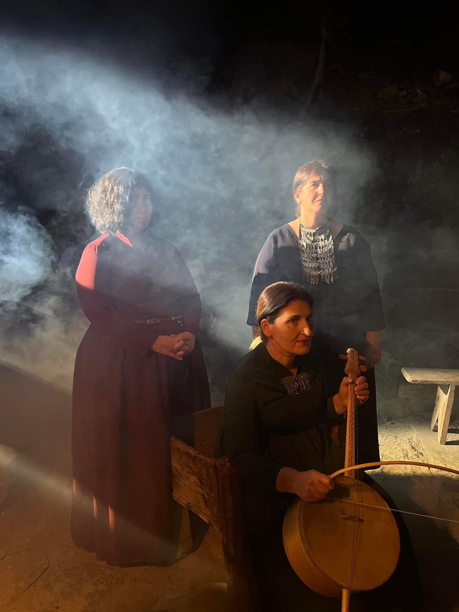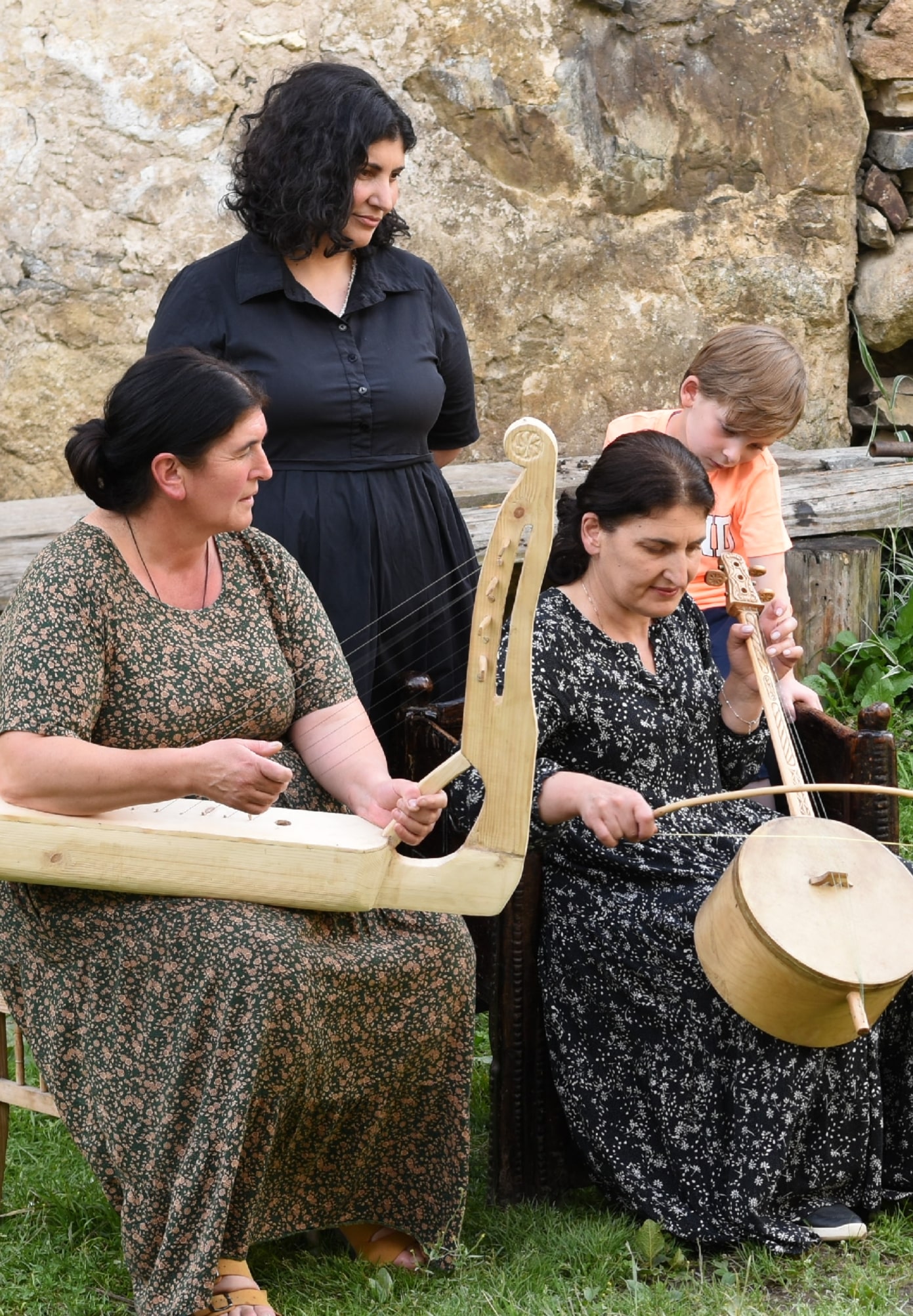 Les Chamgeliani Sisters alors complétées par Levan Bitarovi et Zoé Perret, ont interprété des chants originaires de Svaneti et d’autres régions géorgiennes, passant d’une ballade en hommage à deux frères héros dite Sozar Tsio à un chant inspiré de la mythologie svane sur l’histoire d’amour entre un chasseur et la déesse Dali dit Bail betkil à une ode à la nature des montagnes de Tusheti dit Shen chem tusheto. Quelques instruments passèrent également devant nous comme le chonguri et le chuniri. Dès lors, le son était correctement réglé, nous permettant de saisir plus aisément les nuances de ce chant ancien à la confluence du populaire et du solennel dans ce lieu sacré.