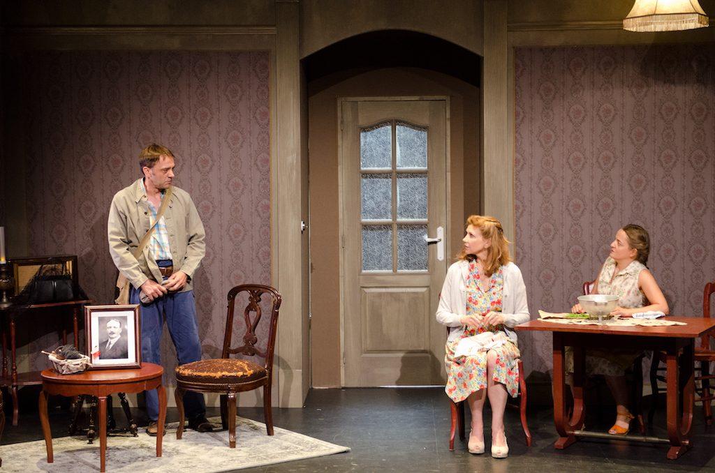 1941, dans une maison de Bourgogne, avec deux femmes qui vont vivre la guerre et l’Occupation chacune à leur manière. La mère, Béatrice Agenin, corsetée de noir et de religion catholique, ne jette aucun regard sur le bel officier allemand qui s’héberge chez elle. Son fils unique a été fait prisonnier par la Wehrmacht et elle souffre en silence, tout en épiant cruellement sa belle-fille, jouée par Florence Pernel, dont elle soupçonne un penchant envers l’élégant Allemand. On comprend vite que Lucile est une épouse malheureuse qui réfrène, aux yeux d’un village partagé entre collaboration et résistance, ses sentiments coupables. Christiane Millet en dame patronnesse et Emmanuelle Bougerol en domestique pleine de vie complètent ce beau quatuor d’actrices autour du beau Samuel Glaume dans une scénographie efficace qui joue sur la transparence des murs et l’opacité des secrets. Et le roman puissant d’Irène Némirovsky arrêtée et déportée en 1942, qui ne sera publié qu’en 2004, est une véritable plongée dans la tourmente d’une époque troublée par les intérêts et les passions que Virginie Lemoine, avec Stéphane Laporte, adapte et met en scène avec beaucoup de justesse et de finesse.