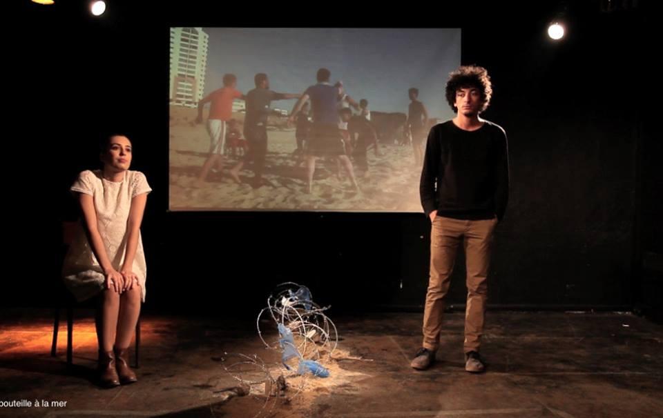 Adapté du roman de Valérie Zenatti, ce spectacle fait dialoguer en toute simplicité deux adolescents, Tal, une étudiante israélienne, et Naïm, un jeune de Gaza. À la source de ce dialogue formidable d’intimité et de liberté, une bouteille jetée à la mer par Tal, avec une lettre roulée à l’intérieur que Naïm va découvrir. Les questions, les doutes, les interrogations de la jeune Juive qui vit à Jérusalem vont percuter le jeune homme, d’abord très fermé et méfiant, puis petit à petit plus ouvert, plus compréhensif. Dans la sobre mise en scène de Camille Hazard, qui a adapté judicieusement le texte, Eva Freitas (Tal) et Aurélien Vacher (Naïm) parviennent à tisser une rencontre riche en émotions, jamais manichéenne, toujours juste quant à la vérité de chaque personnage. Les attentats à Jérusalem, la pauvreté à Gaza, la difficulté de circuler à travers les territoires occupés, le raidissement de la politique militaire depuis les accords d’Oslo forment la toile de fond d’un dialogue spontané, poétique, souvent bouleversant entre les deux jeunes gens. Sans jamais se regarder, face public, ils livrent ce qu’ils ont de plus intime, malgré les bombes et les blocus. Leur volonté de dialoguer, d’échapper aux clichés, aux rancœurs et à la haine. Leur désir de paix. C’est très beau.