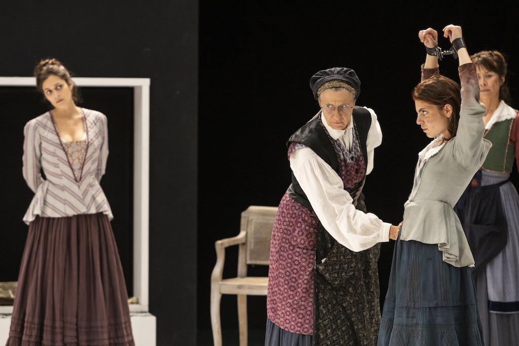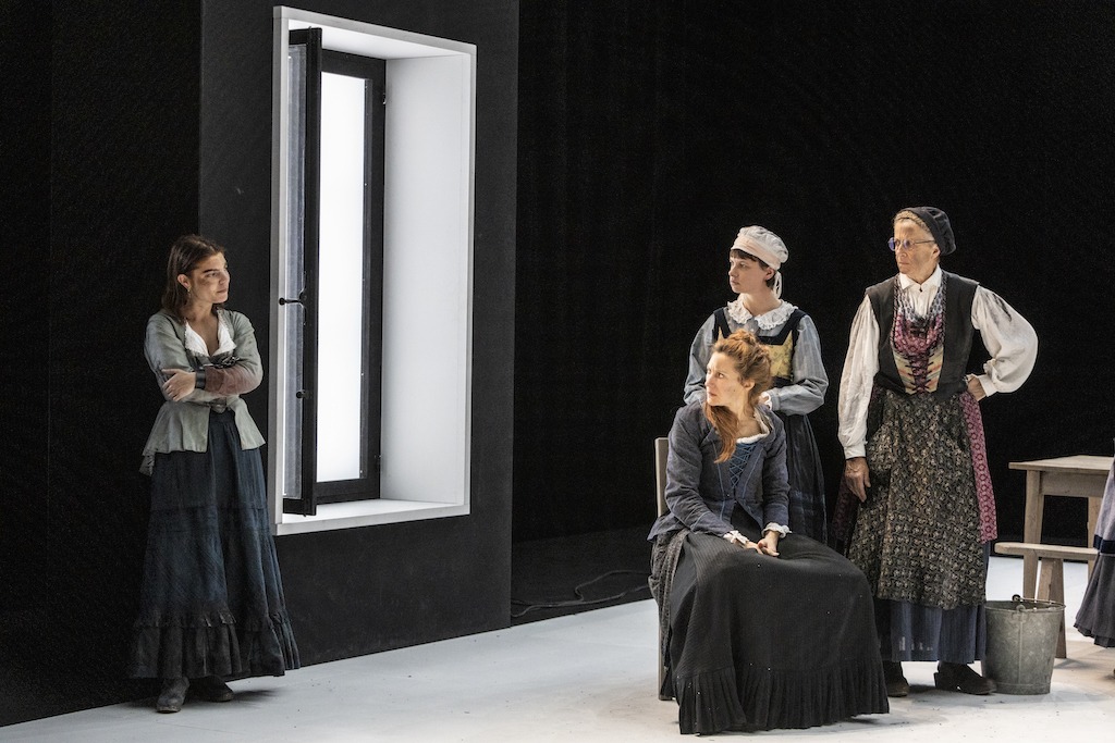 Chloé Dabert se saisit de la pièce à la manière d’une entomologiste avec le souci de nous faire pénétrer dans le quotidien répétitif de ces matrones qui acquièrent soudain un pouvoir de décision qu’elles n’avaient pas. En même temps, l’esthétique somptueuse et les jeux d’ombres d’un Vermeer viennent sertir les visages et les corps de femmes, avec leur coiffe et leurs jupes en drapé de lin gris bleu. Guidées par l’énergique cheffe de bande Elizabeth, que joue formidablement Bénédicte Cerutti, entièrement tendue par sa volonté de sauver Sally, les douze femmes s’épient, se jaugent, puis partagent leurs souffrances et leurs devoirs : les fausses couches à répétition, la difficile récolte des poireaux, les maladies et la perte des enfants, la torture d’être battue par un mari qui rentre ivre d’alcool, brulé par le travail des champs.