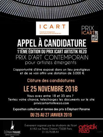 Le Prix Icart Artistik Rezo se déroulera du 25 au 27 janvier 2019 à Éléphant Paname. Pour les candidats, de belles récompenses à la clé et l’opportunité d’élargir son « Rezo ». Le Prix Icart Artistik Rezo encourage la découverte de talents émergents de la scène artistique contemporaine. Le prix est organisé chaque année par des étudiants de l’Icart (l’école du management de la culture et du marché international de l’art) en association avec Artistik Rezo, afin de récompenser des artistes de moins de 35 ans résidents en France.