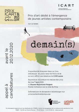 Depuis plus de dix ans, le Prix ICART Artistik Rezo encourage la découverte de nouveaux talents. Il récompense des artistes de moins de 35 ans résidant en France. Les 10 candidat.e.s sélectionné.e.s par les étudiant.e.s de l’ICART, l’école de médiation culturelle et du marché de l’art, participeront à une exposition collective du 5 au 7 mars 2021, à l’Espace Christiane Peugeot. Idéalement situé entre l’Arc de Triomphe et le Palais des Congrès, cet espace de 250 m2 accueille des expositions d’art contemporain.
