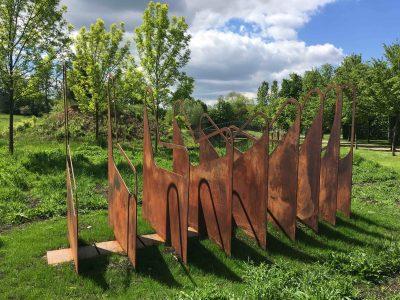 Focus sur l’œuvre « S9-15° » de l’artiste Erell, une sculpture en tôle d’acier rouillé (par traitement chimique) de 8mn d’épaisseurs.