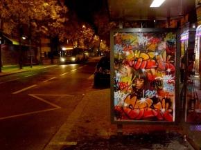 Nebay détourne de nombreuses affiches publicitaires qu’il déloge, peint et réinstalle au petit matin, dans les abris bus.