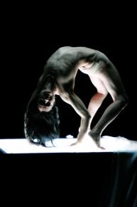 « À travers eux, par la contorsion et ses simulacres d’animalité, je questionne notre mal être, cette violence instinctuelle et aliénante transmise, et mon impuissance à me définir. La répétition d’exercices qui me cassent et les sons du corps qui s’en échappent sont liés aux discours du père et de mon frère, formant une même enveloppe rythmique. Ce projet est une tentative de démystification de la folie. »