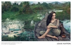 Pour la campagne de publicité institutionnelle Core Values, Angelina Jolie est assise pieds nus dans un bateau traditionnel en bois, au coeur des luxuriants paysages aquatiques de la province de Siem Reap. Près d’elle, un cabas Alto vintage en toile Monogram Louis Vuitton. Le slogan : « Un seul voyage peut changer le cours d’une vie. Cambodge, mai 2011. »