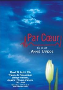 Après avoir exercé de nombreux métiers dans différents secteurs économiques et parcouru le monde. Annie TARDOS met à jour certains des non sens à l’égard de l’homme, où l’homme concourt lui-même à sa destruction. Profondément touchée par cette humanité, elle écrit cette pièce « Par Cœur » dont elle est aussi l’interprète et décide de nous faire sauter le pas.