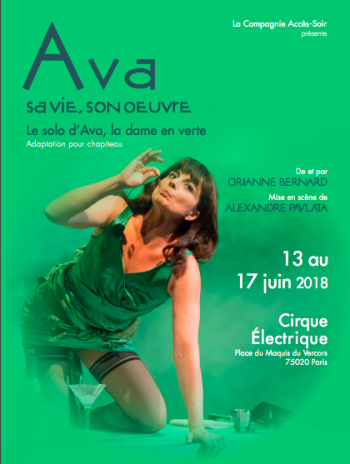 Depuis la création de sa compagnie Accès-Soir (2002), la circasienne Orianne Bernard axe une grande partie de sa recherche autour du personnage clownesque, de son spectre d’intervention, de l’écriture comique et de sa transmission auprès du public. Avec une question récurente : pourquoi, la force émotionnelle que dégage une femme drôle, belle et sexy continue-t-elle à déranger autant qu’elle attire ? Orianne et le metteur en scène Alexandre Pavlata ont tenté d’y répondre en créant le personnage d’Ava, la dame en verte.