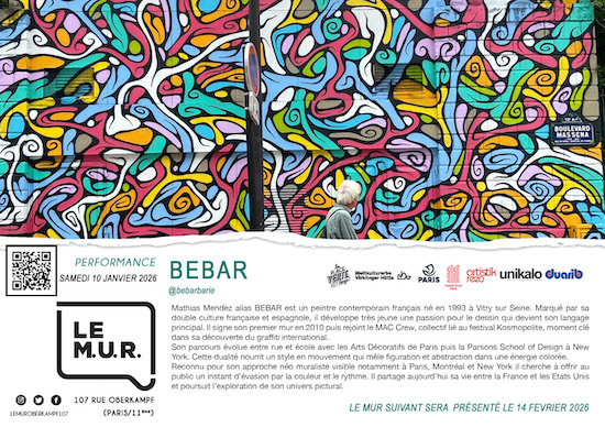 BEBAR interviendra sur le MUR Oberkampf le samedi 10 janvier 2026 à partir de 10h et recouvrira l’œuvre de Loraine Motti.