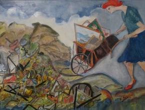 Francine Sidou aussi est attentive à des gestes simples : un visage souffle si fort qu’il est habité et formé par ce souffle. Elle fixe un présent éphémère. Ses tableaux forment une pléthore de scènes, de mises en scène, d’images arrêtées, de fragments de mythologies, de moments d’emportements. Francine Sidou nous emmène en d’autres temps avec son goût prononcé pour la technique de la tempera et ses volumes, où les perspectives s’échappent, se déboîtent, se débinent. En regardant cette profusion, je me sens fécond et un peu perdu… Le présent semble être une illusion.