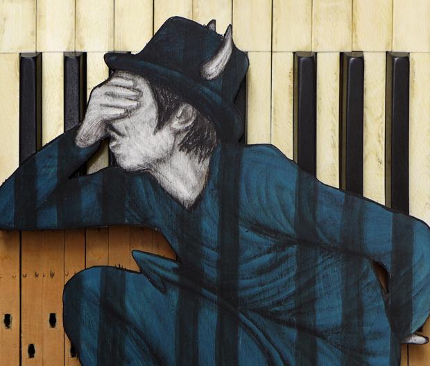 Son assemblage « Le griot » cligne de l’œil au romancier et poète guadeloupéen Ernest Pépin auteur du Griot de la peinture, roman sur la vie de Basquiat. Les pièces « Sacrifice » font écho à la performance d’Arman, co-instigateur du Nouveau réalisme, fracassant lors d’un vernissage en 1962, un piano droit à coups de masse pour ensuite en rassembler les débris constitutifs du tableau Chopin’s Waterloo, en signe de rejet de la musique dite « bourgeoise » à l’instar d’un Dali pour qui cet instrument symbolisait la décadence de l’art au service de l’oligarchie ! Le tableau « Bird’s Lament » est éponyme du morceau composé par l’ébouriffant « Viking de la 6e avenue » Moondog, en hommage posthume à son ami Charlie « Bird » Parker…
