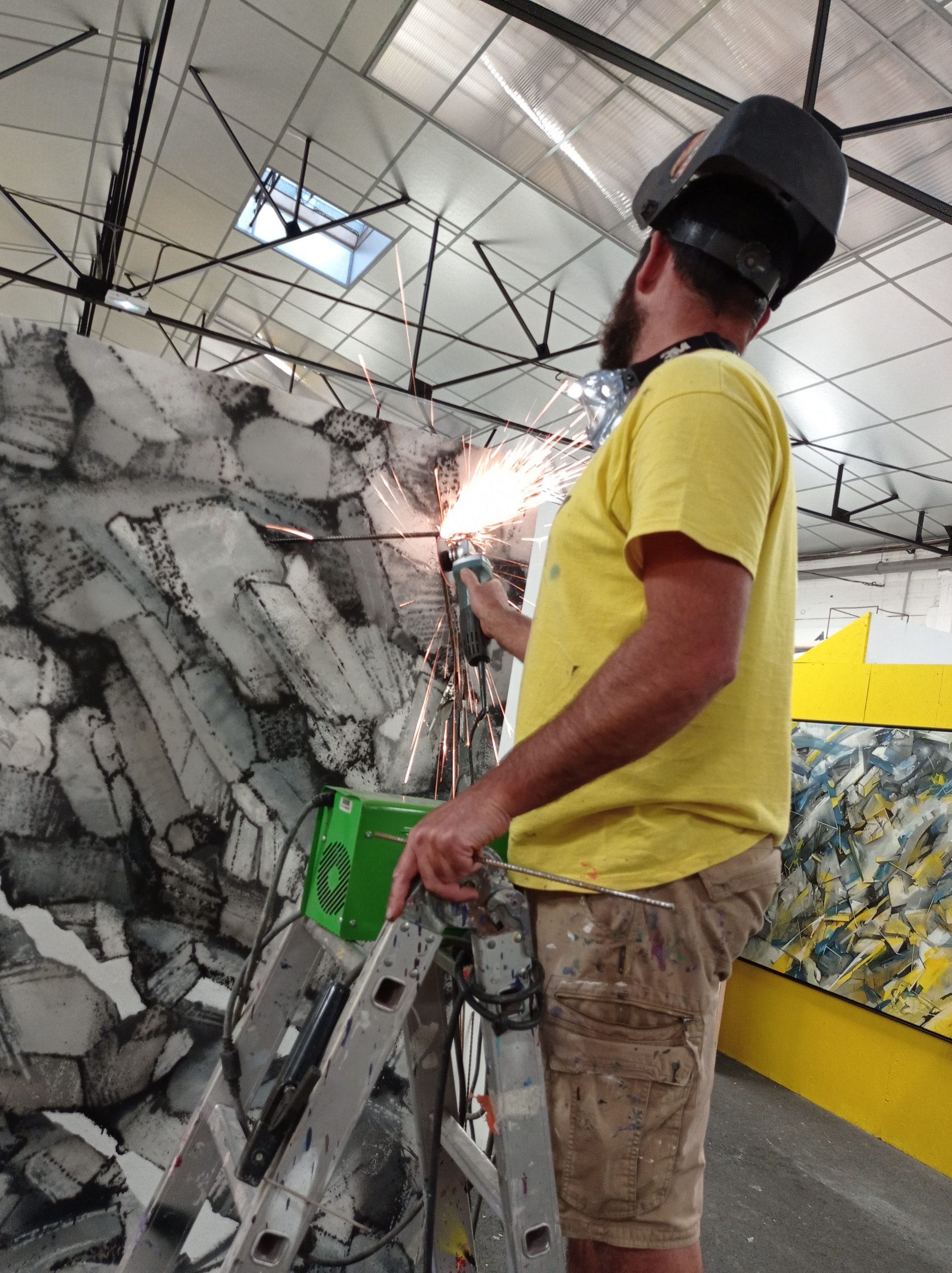 Son process se veut lâché, instinctif, voire brutal, laissant chaque œuvre transmettre une énergie propre. À cheval entre univers minéral et abstraction pure, il déstructure son environnement et interprète la matière comme un magma en perpétuel mouvement.