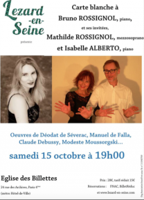 L’association Lezard en Seine donne Carte Blanche à Bruno Rossignol (Chef d’Orchestre et Pianiste) le temps d’une soirée. Il sera accompagné de Mathilde Rossignol et Isabelle Alberto. A propos de Bruno Rossignol De 1985 à 1995, il fut le chef de choeur des spectacles musicaux de Jean-Michel Jarre, qu’il a accompagné à Londres, Paris-La Défense (1990), Berlin, Budapest, Séville, Barcelone, Saint-Jacques-de-Compostelle, Mont-Saint-Michel… Il a été directeur des Conservatoires de Jouy-en-Josas (1989-1992), Suresnes (1992-1997), Orsay (1997-2000), Bourges (2000-2005) et Paris 10e Hector Berlioz (2005-2010). Il est directeur du Conservatoire à rayonnement départemental (CRD) de la Dordogne depuis 2011. Depuis 2011, il est directeur artistique de l’ensemble instrumental de la Dordogne (E.I.D.) avec lequel il se produit principalement en région Aquitaine. Il a créé dans le même temps le Chœur de Dordogne.