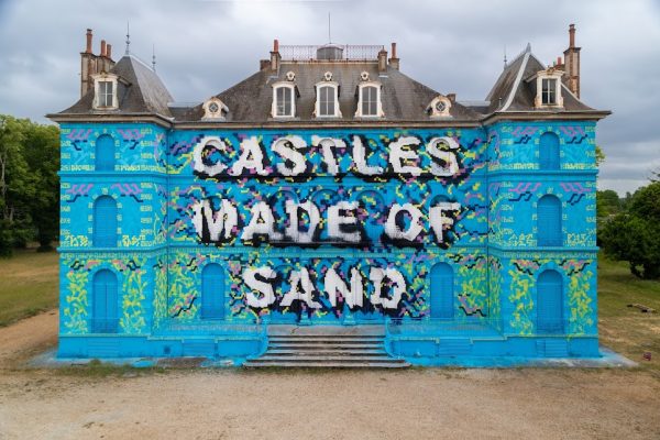 Le tandem a décidé de travailler autour de l’image du château de sable pour évoquer l’éphémère, moteur premier de l’art urbain. Sur la façade principale, des lettres blanches ont pris place, dessinant un monumental “Castles made of sand” (“Châteaux de sable”). Des lettres qui semblent s’évaporer, comme des grains de sable qui volent au vent.