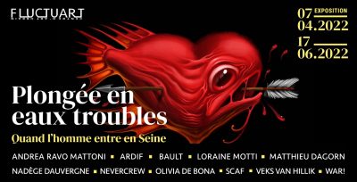 11 artistes issus de l’art urbain s’emparent de Fluctuart et entraînent le visiteur dans un voyage initiatique à travers des œuvres inédites consacrées à la faune aquatique de la Seine. Un parcours artistique rythmé par les silures, anguilles, perches, brochets ou poissons rouges… mais aussi par leurs avatars mythologiques ou mutations biologiques : sirènes, tritons ou monstres hybrides. Une exposition collective en écho à l’exposition « Incursions sauvages » au Musée de la Chasse et de la nature du 11 avril au 10 septembre 2022.