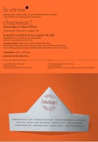 Chapeaux ! Hommage à Robert Filliou De Jakob + Macfarlane Du 3 octobre au 21 novembre 2014 Du lundi au vendredi de 10h à 19h Entrée libre La vitrine am |