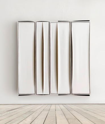 L’artiste compose différentes strates à partir de la toile elle-même, déchirée, superposée, tordue, pliée, agrafée selon un process pré défini.