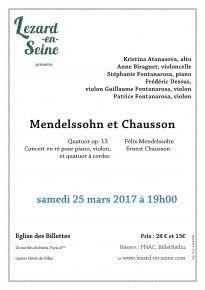 L’association Lezard en Seine organise une soirée musicale à l’Eglise des Billettes. Mendelssohn et Chausson seront à l’honneur. Programme du concert du 25 mars 2017 Quatuor op. 13 de Mendelssohn •Adagio – Allegro vivace Entracte Concert pour piano, violon et quatuor à cordes A propos de l’Association Lezard-en-Seine : Créée fin septembre 2007, Lezard-en-Seine compte 120 membres et organise chaque saison entre 6 et 8 spectacles à Paris : surtout des concerts de musique de chambre, mais aussi des concerts symphoniques, des spectacles de musique du monde (chants berbères, indiens ou italiens) ou encore des pièces de théâtre. Depuis sa création, ce sont environ 50 spectacles auxquels ont assisté près de 7000 personnes. [Source Texte : Communiqué de presse] |