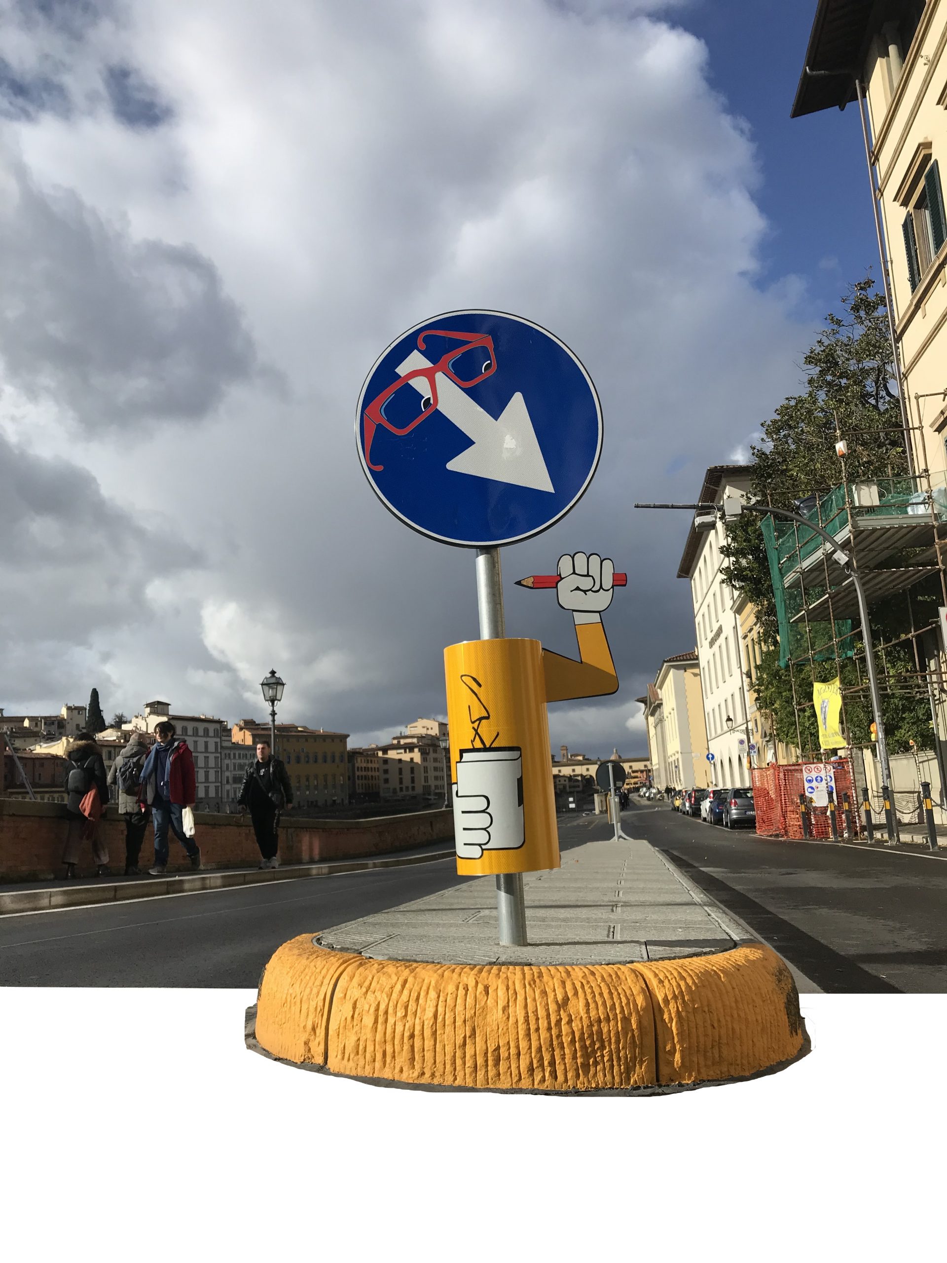 Clet offre et associe à ces panneaux, aux ordres sans concession ni discussion possible, une pointe d’humour, de poésie et d’ironie. Une bonne occasion pour créer un lien là ou il y a le plus souvent un refus et de permettre une meilleure digestion de l’ordre imparti.