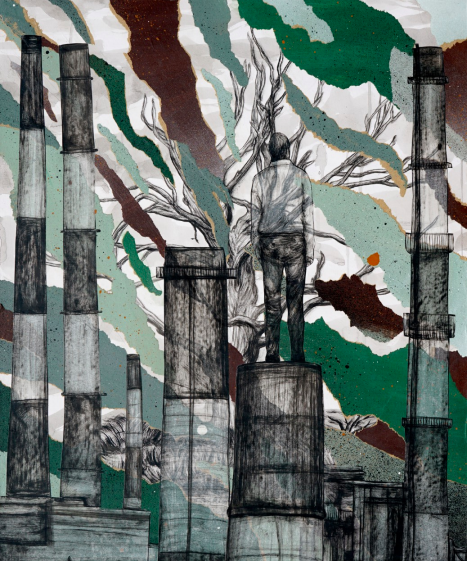 Fulminations fait penser au tableau du peintre romantique allemand Caspar Friedrich et son Voyageur contemplant une mer de nuages de 1818. Dans l’œuvre de Levalet, intégrant pour la première fois dans son travail des effets d’arrachages et de lacérations, le personnage n’a que la fumée des cheminées et la forêt qui se déchire pour tout horizon.