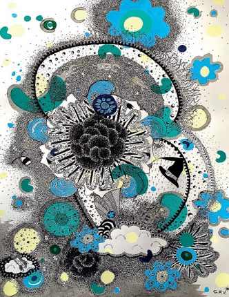 Influencées par son expérience scénique, les peintures de Gwendoline sonnent comme des musiques sur papier. Son processus de création, qu’elle nomme “Encre caviar”, mêlent des motifs pointillistes réalisés à l’encre de Chine donnant naissance à des compositions arachnéennes peuplées de constellations biomorphiques et de symboles équivoques, à l’image d’un tatouage sur la peau. Crazy caviar met l’accent sur la vibrance des éléments qui se répondent entre eux et la dynamique des couleurs utilisées.