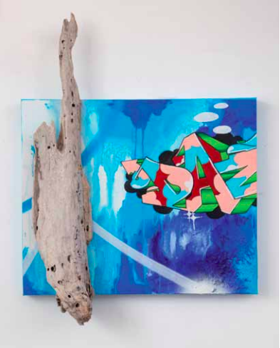 Mais Daze ne se limite pas à ce registre figuratif. Sur les deux toiles intitulées Spoiler Alert et Inside the Blues nous découvrons un tout autre travail porté vers l’abstraction. La signature, ce par quoi tout commence dans le monde du graffiti, y joue un rôle majeur. L’artiste l’a traitée dans le dynamisme viril qu’on lui connaît. « Tag éternel » absolument maîtrisé il s’échappe en partie du cadre affirmant ainsi l’esprit de liberté qui est le sien. À cet élément fort symbolique en est associé un autre qui ne l’est pas moins. Le bois, qui pour la première fois est incorporé aux peintures, est un bois flotté choisi pour sa façon d’avoir été travaillé par la nature, nous confie l’artiste. On comprend bien « la valeur » de ce matériau que l’on imagine sur les flots, témoin d’une vie aquatique dont on y ignore tout, rappel de notre petitesse face à la grandeur des mers.
