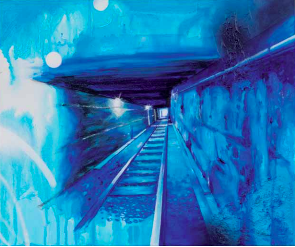 Dans la série consacrée aux tunnels et ses mystères, réminiscence du métro new-yorkais, la perspective nous projette vers l’unique point de fuite, espace blanc quasi magique qui nous happe et nous fascine à la fois nous proposant un voyage solitaire enchanteur. Cet univers en noir et blanc bien loin d’être hostile apprivoise nos craintes pour nous guider au cœur même de son secret. Est-ce l’impact du soleil blanc ; halo de lumière au premier plan ; qui renforce notre rassurance ? Quoiqu’il en soit il participe à notre adhésion. Les tableaux sont si empreints de vérité émotionnelle que l’on y entre avec confiance, suivant les rails dans leur promesse d’aventure. Dans la version bleue, Untitled, le charme est toujours là. Dans une ambiance azurée rails et tunnel nous propulsent vers un point blanc immaculé, but ultime de l’exploration ou début de tout. Cette série montre bien où se cache le génie de l’artiste. C’est-à-dire dans cette capacité à savoir extraire des lieux à priori inhospitaliers, un périple souterrain d’un genre inattendu empreint de poésie.