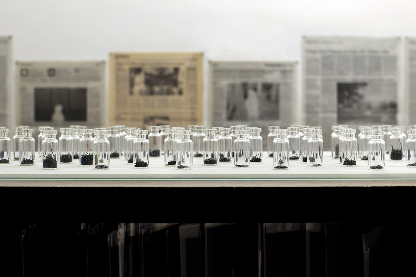 Estefanía Peñafiel Loaiza, Sans titre (Figurants), 200 fioles en verre, gomme à effacer, journaux (de 801 à 1000) © Courtesy de l’artiste