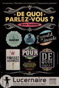 Il s’agit de 5 pièces courtes comiques écrites par Jean Tardieu : 5 pièces et un même personnage principal : le langage ; 5 pièces comiques, décalées, surprenantes ou terrifiantes alliant toujours dérision et poésie ; 5 pièces, 18 personnages, 4 comédiens ! « Finissez vos phrases » : Deux anciens amants se retrouvent par hasard lors dʼun bal costumé. Surprise, trouble, inquiétude, espoir… Suspendus à leur émotion, écartelés entre leurs hésitations et leur désir renouvelé, ils sʼabordent avec prudence et laissent toutes leurs phrases en suspens. « Oswald et Zénaïde » : Cette petite pièce a pour objet dʼétablir un contraste comique entre la pauvreté des répliques échangées à haute voix et lʼabondance des « apartés ». La pièce est une parodie des aveux impossibles, où la parole est empêchée par égard pour lʼautre. « De quoi sʼagit-il ? » : Monsieur et Madame Poutre se rendent au tribunal pour porter plainte contre « lui » et en sa faveur. Le couple est incapable de déterminer la fonction du juge, lʼappelant « mon père » ou « Monsieur le proviseur… ». Leur acharnement à transformer son identité finit par contaminer le magistrat qui, troublé, dérape et perd pied. « Le guichet » : Lʼadministration, figée et angoissante, devient, dans lʼespace dʼun bureau de gare, un lieu écrasant et oppressant. À la froideur des employés sʼopposent lʼincohérence et la fragilité dʼun client qui rate son entrée, hésite sur sa destination, se montre incapable de donner son nom ou son âge. « Un mot pour un autre » : Vers lʼannée 1900, une curieuse épidémie sʼabat sur la population des villes. Les misérables atteints de ce mal prennent soudain les mots les uns pour les autres. Les conversations paraissent alors dénuées de sens, mais les malades ne semblent pas sʼapercevoir de cette anomalie et continuent de se comprendre parfaitement.Et si les mots ne jouaient quʼun rôle secondaire ou nʼétaient quʼun habillage des intentions profondes ?