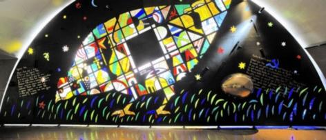 La richesse patrimoniale du métro continue de s’internationaliser avec ce nouvel échange culturel franco-russe, dont le thème est celui de « la poule aux œufs d’or ». L’œuvre Ryaba la poule est signée de l’artiste russe Ivan Loubennikov. Si elle est un hommage à la culture russe populaire, cette œuvre inspirée des contes russes raconte surtout la profonde mutation de la Russie à travers les siècles. La sensibilité de l’artiste est révélée par un travail de la matière, de la couleur et de la lumière. Le travail d’Ivan Loubennikov se dresse sur une surface de 40 mètres carrés, monumental ! Vingt panneaux sont incrustés d’éléments verriers, et se déploient pour offrir aux voyageurs une histoire qui hésite entre tendresse et cruauté. Un œuf de 80 kilos trône au centre de cette œuvre impressionnante. On murmure que les vertus merveilleuses de cet œuf ont transcendés le temps et la géographie, et quiconque effleurerait sa coquille pourrait se voir condamner à la chance et la prospérité !