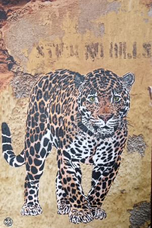 « Tout en continuant à explorer le rendu pochoir/pinceau dans mon univers animalier et, en l’occurrence, félin, j’ai eu envie pour cette exposition de présenter un nouveau support.