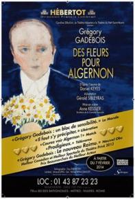 Des fleurs pour Algernon De Daniel Keyes Mise en scène de Anne Kessler Avec Grégory Gadebois À partir du 7 février 2014 Tarifs : 1ère cat. : 39€ // 2ème cat. : 29€ // 3ème cat. : 19€ // 4ème cat. : 13€ // Tarif groupes : 30€ en 1ère cat. // Tarif moins de 26 ans : 10€ Réservations en ligne ou par tél. 01 43 87 23 23 Durée : 1h20 Théâtre Hébertot |