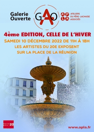 Créée en 2022 par les artistes du Père-Lachaise Associés, la Galerie Ouverte (ou GAO) a pour particularité d’accueillir les autres associations artistiques du 20e telles que celles de Belleville (AAB) et de Ménilmontant (AdM). Elle a lieu à chaque saison. Chaque artiste crée sa propre galerie en plein air sur la place de la Réunion et accueille le public tout au long de la journée. Une galerie spéciale “petits formats”, 20×20 cm, pour les fêtes de fin d’année sera également proposée par une trentaine d’artiste du XXe.