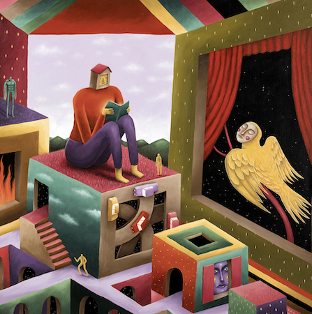 Les structures géométriques, les ponts, les portes et les escaliers composent l’architecture d’un rêve conscient. Les personnages explorent ces espaces avec calme, comme s’ils en connaissaient déjà les contours. La figure récurrente du personnage à tête de maison incarne cette idée d’un esprit-refuge. Autour de lui gravitent d’autres figures hybrides : oiseaux à visage humain, chevaliers, anges, démons, parfois minuscules, parfois monumentales, formant une population silencieuse évoluant dans un état suspendu.