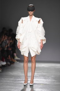 Zone 1 « SENS » ET « FORME » Cette section montre les approches conceptuelles de Keisuke Kanda et Kunihiko Morinaga et leur intérêt pour l’aspect pratique à travers leurs collections successives. Les vêtements créatifs de keisuke kanda (Keisuke Kanda) déconstruisent et réorganisent tout ce qui dé nit nécessairement le vêtement – le style, l’usage, la fonction, le genre, l’âge, etc. Le procédé qui consiste à se défaire de la dé nition originelle et habituelle des vêtements, d’un point de vue tant physique que de sens, pour les réassembler au moyen d’une confection manuelle délicate, a quelque chose de surréaliste dans l’expression et n’est pas sans lien avec l’artisanat d’art traditionnel du Japon. La manière dont sont exposés vestes, tailleurs, sous-vêtements, chapeaux, sacs, etc., montre clairement cette déconstruction et ces transformations. Pour chaque nouvelle collection, ANREALAGE (Kunihiko Morinaga) conçoit ses vêtements à partir d’un thème ou d’un concept qui révèle sa vision, à la frontière de l’ordinaire et de l’extraordinaire. Le procédé qui permet d’appliquer ces thèmes à des articles standard dépasse largement le cadre de la mode pour se rapprocher d’œuvres d’art conceptuel ou de poèmes à forme xe comme les haïkus. Trench-coats, chaises fabriquées chaque saison comme symbole de la boutique et cartons d’invitation des collections successives sont exposés dans cette section. Ils montrent la manière dont ANREALAGE introduit une thématique dans une forme xe, lui donne forme, et comment ses vêtements établissent la communication avec d’autres personnes.