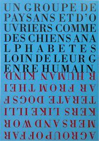Jean-Michel Alberola imagine pour les deux pages qui introduisent la description bibliographique des vingt-neuf livres qu’il a créés à cette date, deux images faites des mots : « Un groupe de paysans et d’ouvriers comme des chiens analphabètes loin de leur genre humain ». Page de gauche, le texte en français, en lettres manuscrites, en noir et en rouge,  se superposant au tracé en rouge d’une tête d’âne ; page de droite, le texte en anglais, en typographie en noir, encadré d’un filet rouge.