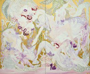 « Et comme je lui répondais que j’aimais une mortelle, boudeuse et dépitée, elle pleura quelques larmes, poussa un éclat de rire, et s’évanouit en giboulées qui ruisselèrent blanches le long de mes vitraux bleus. » Aloysius Bertrand, « Ondine », Gaspard de la nuit (1842) Parmi les tristes fables qui ponctuent l’histoire légendaire d’Hollywood, l’une des plus frappantes pourrait être celle de l’actrice anglaise Peg Entwistle. En effet, cette dernière se suicida en 1932 en se jetant du haut de la lettre H du fameux signe ‘Hollywood’, perché sur les collines baignées de lumière dorée de la ville des anges. C’est Kenneth Anger, le cinéaste iconique de la contre-culture californienne, qui livre l’anecdote dans son fameux recueil Hollywood Babylone, paru en 1959, et relatant les dessous sordides et autres scandales du boulevard des rêves brisés de Los Angeles. Deux décennies plus tard, la chanteuse folk californienne Dory Previn évoquera, dans son poignant Mary C Brown and The Hollywood Sign, cette incarnation douloureuse de la face sombre d’Hollywood et du bonheur perdu d’une actrice au bord du désespoir.L’iconographie si singulière de Lucile Littot s’est forgée, ces dernières années, alors qu’elle vivait sur la côte ouest américaine, et s’est développée en creux de la culture visuelle de cet Hollywood fantasmé des années 1940-50, tant l’artiste semble à la fois rebutée et fascinée par son flamboiement et par sa décadence. Les mythes féminins qu’elle développe dans son travail sont ceux qui siéent aux héroïnes littéraires et cinématographiques—les Lolita, les Myrtle Gordon, les Dorothy Vallens ou les Olympia modernes—et font subtilement écho à des personnages de princesses décadentes qui se déhanchent, la tête haute et le regard fier. La pratique de Lucile Littot frappe par les tons pastel de sa palette de couleurs, les enchevêtrements baroques de ses céramiques, l’étrangeté kitsch de ses installations et l’excentricité de ses performances. Mais ces derniers semblent renfermer, sous leur dorure digne d’un décor versaillais, des craquellements profonds, des fêlures intenses et une vive émotion. La série de peintures intitulée « Dolorès 2028 », en référence à Lolita de Nabokov et à Lola de Jacques Demy, se compose d’un ensemble de toiles de grand format, parfois exposées en diptyques ou sous la forme d’un paravent. De cette représentation des amazones du Moyen-Âge jaillissent une énergie festive pareille à celle d’un cabaret parisien des années folles, et un érotisme mortuaire. On y croise d’étranges créatures, tel cet âne aux yeux exorbités, ou encore cette femme à l’allure zombiesque avec ses huit têtes chauves, mi-poulpe, mi-incarnation de l’artiste Claude Cahun. L’installation qui trône dans l’exposition est un lit impérial maculé d’objets et d’éléments sculpturaux, reflétant l’univers fantasmagorique de l’artiste—une boule à facettes scintillante, une paire de talons en céramique blanche, des rubans dorés, des éventails pourpres. C’est sur ce lit nuptial que l’on se prélasse en robe du soir, que l’on danse des heures durant, que l’on s’aime langoureusement, et que l’on dort, au petit matin, enfin, les yeux fardés et fatigués de celles qui ont vu dans la nuit l’éclat du soleil. Martha Kirszenbaum, février 2017 Avec la participation du centre d’art Les Bains Douches, Alençon A découvrir sur Artistik Rezo : [Source : © communiqué de presse] |