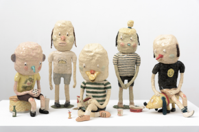 Ces petites figures caricaturales, à la fois humaines et animales, comme des mannequins ventriloques, nous rappellent à notre enfance et à la vulnérabilité qui s’en dégage.