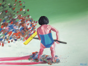 L’œuvre de Raphaëlle Ricol me semble fonctionner comme un “exorcisme par ruse”, ainsi qu’Henri Michaux qualifiait ses poèmes. Le grotesque et l’ob-scène, ce qui se trouve derrière la scène, font saillie au cœur de tableaux aux sujets déroutants : une gueule de serpent jaillit d’un buste humain, un homme est expulsé par une “tête pubienne”, une femme en maillot astique énergiquement le pas de sa porte, en un geste que l’on devine destructeur, pour “faire le vide”, probablement. En d’autres tableaux, des personnages mutants nous tournent le dos, dont les membres assemblés, de provenances multiples, décrivent une identité incertaine, morcelée…