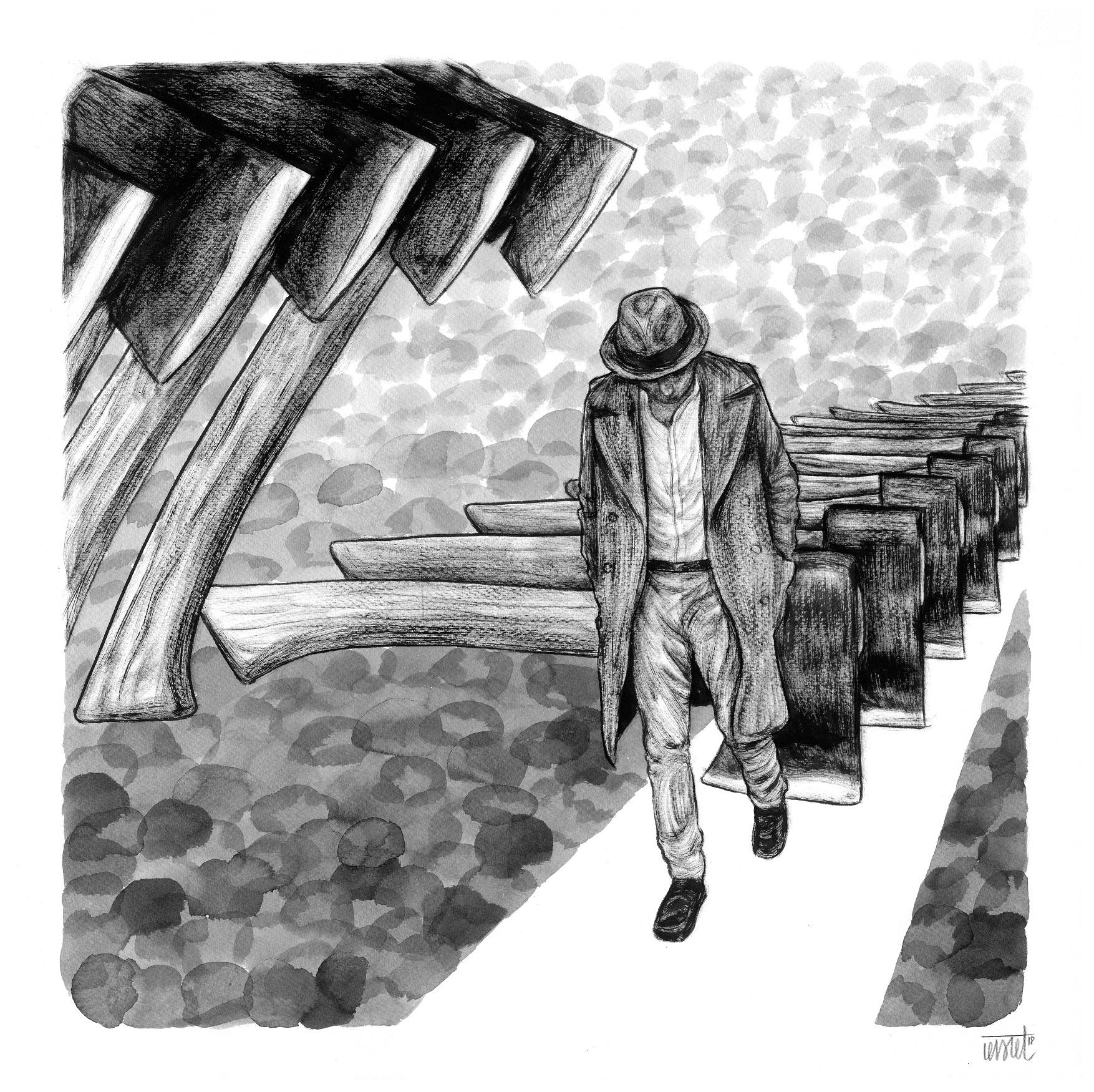 C’était compter sans le regard de Levalet qui, en un autre temps mais au même âge que le poète, vient joindre à son écriture la plus noire ses images de malice où le noir de l’encre de Chine domine et s’emploie à ronger le blanc du papier.