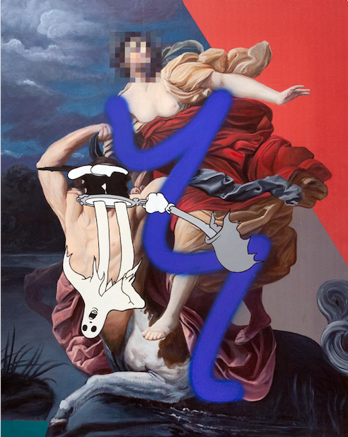 « C’est cette fragmentation que je veux représenter dans mon travail. Pour certaines réalisations, je commence par chercher des photos sur Google images. Je les sépare ensuite en différentes typologies et les utilise pour créer une nouvelle mythologie avec mes dessins. Pour d’autres pièces, je choisis des chefs d’oeuvre du Louvre et j’y ajoute des éléments de la culture populaire ; je termine par un trait à la bombe aérosol. »