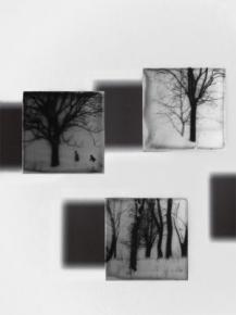 Les pieds dans la neige en sandales de soie, ce sont des paysages de campagne hivernale, d’oiseaux qui s’envolent, de sous-bois et de bord de mer réalisés entre 2005 et 2012, tirés sur papier gravure, support sur lequel on raconte une histoire qui apparaît en filigrane. C’est aussi une centaine de pièces récentes réalisées en janvier et février 2013, accrochées en nuage, mettant ainsi en valeur la légèreté des images: paysages de bord de rivière, d’arbres les pieds dans l’eau, d’arbres sous la neige, de camélias en fleurs… Et enfin, une série d’une cinquantaine d’images réalisées précisément entre le lundi 4 mars et le jeudi 7 mars, présentées dans l’ordre de prise de vue.