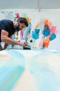 La toile est le support d’un geste spontané. Le trait noir circule entre les aplats de couleur et peut s’effacer pour interroger le spectateur sur ce qui nous lie et nous sépare.