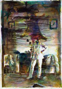 Que montrent ses images ? En apparence, rien de violemment direct. La peinture y oscille entre figuration et dissolution et l’aquarelle, appliquée sur l’isorel, une surface non-absorbante, s’y dissout dans un magnétique effet de flaque? Ici, dans une composition à la lisière de l’abstraction, l’on distingue tout juste un homme tombant en arrière dans l’eau, là une femme devant une voiture, une femme asiatique assise sur les genoux d’un GI américain, une femme allongée au milieu d’une prairie. La notion de culpabilité qui réunit ces images et unifie leur propos n’est pas déclarative. Elle se déduit, tandis que nous appliquons à ces images un « regard pensif », de l’atmosphère ambivalente qui émane de choses vues de manière subliminale.