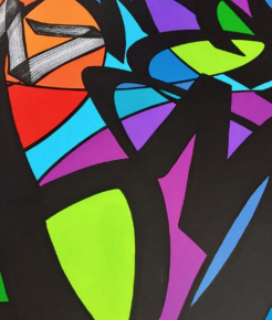 Un univers artistique riche en couleurs, un style propre, fait de formes cernées par une ligne épaisse et traitées en aplats de couleurs pures et sans ombres. Ses œuvres se singularisent par la saturation des surfaces colorées où ne subsiste aucune trace de doute ou d’inachèvement.