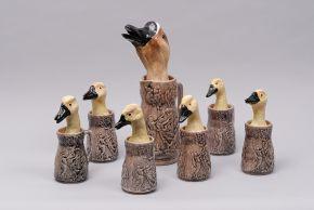 Telles sont les frontières à l’intérieur desquelles se développent les œuvres de Sébastien Gouju, qu’il s’agisse d’un bassin aux nymphéas, soit Giverny et la peinture de Monet prosaïquement rendus aux dimensions d’une vasque de lavabo ou encore, pour les amateurs de contes de fées, d’une baguette magique, simple branche ramassée, à l’extrémité de laquelle se referme une étoile, de mer comme il se doit. Autant d’associations en apparence incongrues, qui prennent ici corps dans le registre du familier – caractère courant des objets, réalisme de leur restitution en faïence émaillée ou en peinture. Et la surprise, le plaisir aussi, n’en sont que plus grands. Mais il y a plus. De la grille formée par les carreaux de verre aux arabesques tracées par les tentacules du poulpe, c’est toute une histoire de l’ornement qui s’écrit, l’air de rien, entre les excroissances végétales orchestrées par l’Art Nouveau et la rigoureuse épure prônée par l’esthétique moderniste. Comme une libération du motif décoratif après sa condamnation morale par Adolf Loos, et suivant le mécanisme qui fait naître des visions inédites d’un détail caché dans un papier peint ou des lignes qui structurent le bois, celles-là même à partir desquelles ont pu se dresser des forêts dans les frottages de Max Ernst. Et si l’univers de Sébastien Gouju résonne encore d’échos surréalistes, il n’en est pas moins solidement ancré dans notre temps, celui de la séparation consommée entre l’homme et la nature et du succès croissant des grands magasins de bricolage. Dans leurs allées, on croise en effet à l’envi des galets à carreler, du gazon en tapis, des bambous à poser aux murs, des fauves en coussins, sans parler de tout le nécessaire pour entretenir des fragments de végétation confinée en appartement ou au mieux sur un balcon : tous traduisent, au summum du substitut et de l’artifice, le désir de nature de l’habitant des villes qui y vit si retranché qu’il pourrait bien croire à la fable de la branche de cacahuètier, ce défi aux lois de la botanique représenté pourtant ici d’une façon si vraisemblable. Ce dont l’homme s’entoure, l’environnement qu’il se fabrique, bref son cadre de vie : voilà ce que Sébastien Gouju met en jeu dans ses dernières sculptures, ainsi que dans ses récentes expérimentations picturales lesquelles associent, sur le mode du collage, des représentations de divers objets, de plantes ou d’animaux, qui par la juxtaposition se transforment en motifs, dans des compositions qui, en écho aux sculptures, fonctionnent comme des répertoires autant que des décors. L’artiste propose à l’imagination des hybridations non encore advenues ou à l’analyse des archéologues du futur des emblèmes de notre civilisation légèrement transformés. À ceux qui voudraient ainsi faire l’histoire d’objets aussi communs – et volontiers jugés kitsch – que le pichet de Côtes du Rhône (immortalisé par les sketchs des Deschiens) ou les hirondelles porte-bonheur de façades (qui désignent « Notre nid »), l’artiste propose de riches sujets de réflexion, à la croisée du quotidien et de la fable. Dans cet univers, les hirondelles ne volent pas pour annoncer le printemps, mais les rossignols se cognent contre les murs et y restent fichés, dans la lignée des gags cruels à la Monty Python ; les récipients ne s’adaptent pas à la conformation de leurs utilisateurs, comme dans La cigogne et le renard de Jean de La Fontaine, ce sont des volatiles qui en sortent leurs têtes. Toute une basse-cour surgit ainsi de pichets plus ou moins ornés : de la famille coq et poules qui pointent leurs becs hors du col de pichets standard, motif flammé, au paon majestueux se dressant hors d’un vase turquoise. Il y va là tant de l’anthropomorphisme qui se manifeste dans les objets (un pichet possède un col, une panse, des lèvres), que du règne animal sur lequel l’homme – depuis la domestication – n’a cessé d’étendre sa domination, mais qui toujours fait retour, camouflé même dans l’élément de décor ou l’objet utilitaire le plus insignifiant. « Nature aime à se cacher. », dit Héraclite dans l’un de ses fragments. Avec Sébastien Gouju, elle fait partie du décor. Guitemie Maldonado