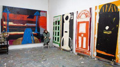 «The Doors of Perception» présente une nouvelle série de peintures et de dessins inspirés par la compréhension spatiale des artistes de marcher dans son appartement. Les œuvres organiques de Hutchings reproduisent les dimensions de la taille moyenne d’une porte. Les portes dominent l’imaginaire domestique comme passerelle vers l’espace et le temps au quotidien. Parallèlement à cela, Two Lamps at Night, une ambitieuse peinture à grande échelle d’un intérieur de salon sur quatre toiles distinctes, sera présentée pour la première fois. En utilisant un processus physique, l’artiste a continuellement déplacé le coin peinture à coin et à l’envers laissant le travail évoluer spontanément.